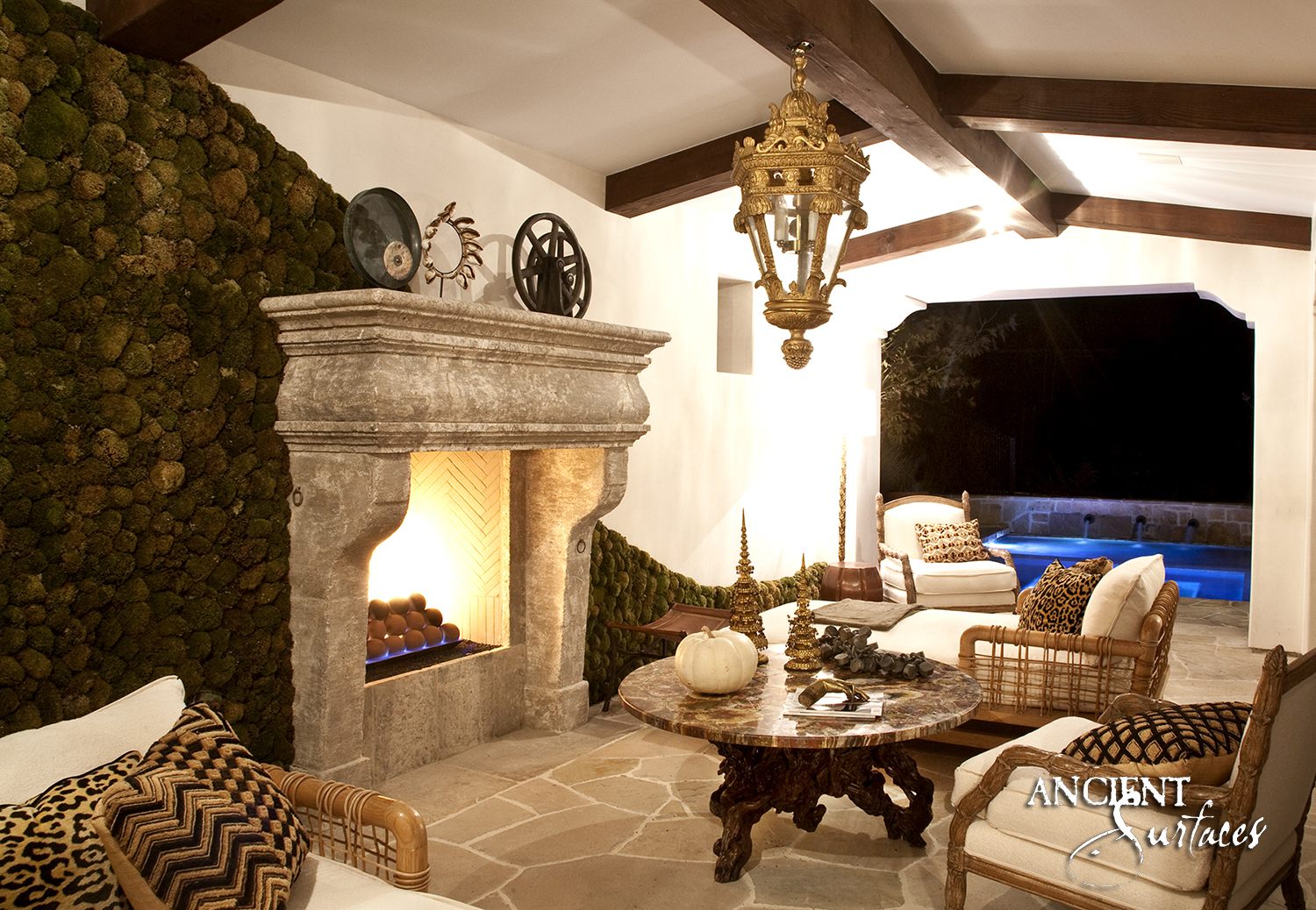 An outdoor fireplace that’s hand carved out of limestone can turn a regular yard to an ‘Al Fresco’ living room. Adding a harmonious and exciting space for kids to hover over as they roast marshmallows over a rustic wood burning flame or relaxing with a glass of wine in the evening with friends and loved ones are some of the numerous mood and climate altering applications of any outdoor antique limestone fireplaces you’ll find at Ancient Surfaces.