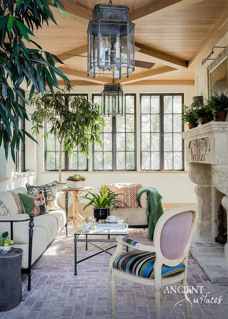 There’s an unmistakable Mediterranean soul in this fireplace, the limestone darkened with age, the surface etched with faint traces of tool marks, each one a fingerprint of history. Framed by windows and rustic beams, the room feels lifted from a Tuscan farmhouse. But this isn’t nostalgia, it’s preservation. A living memory built into the architecture of the present. The mantle doesn’t merely hold the fire; it holds the weight of time.