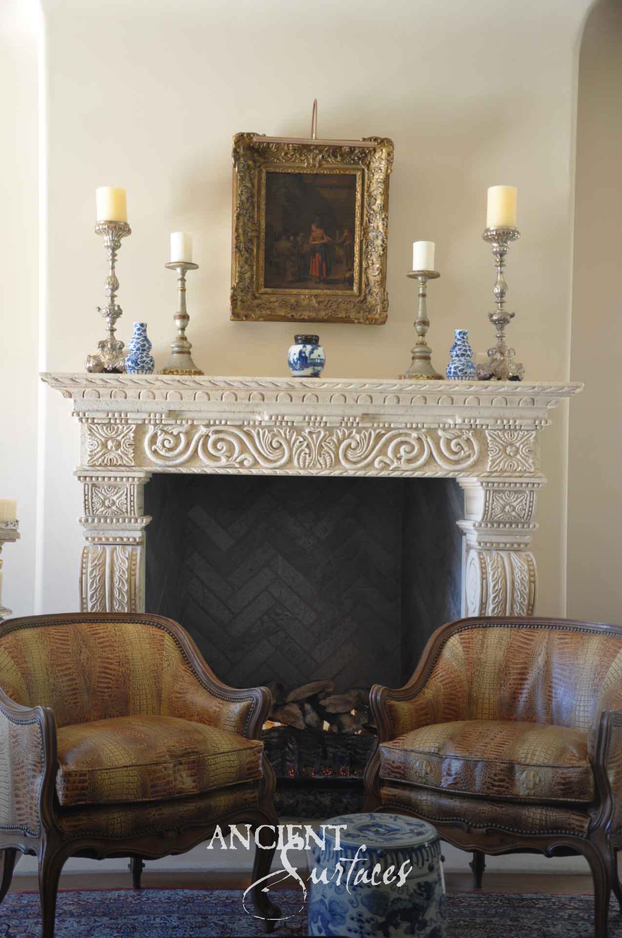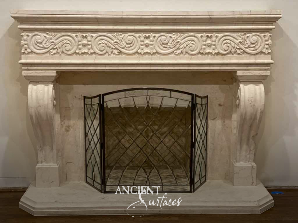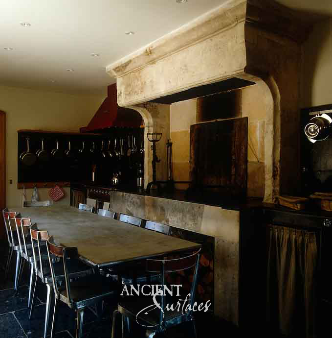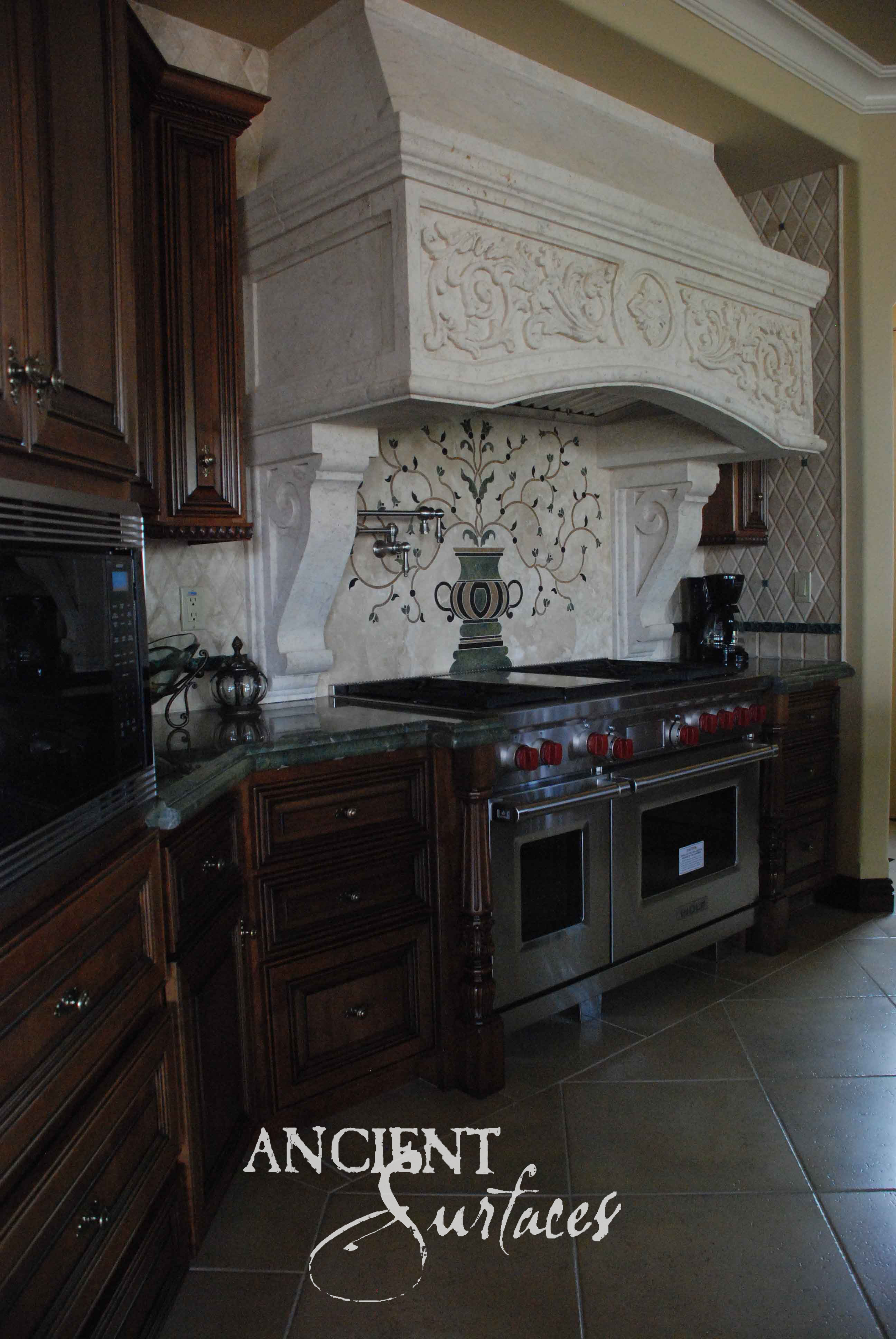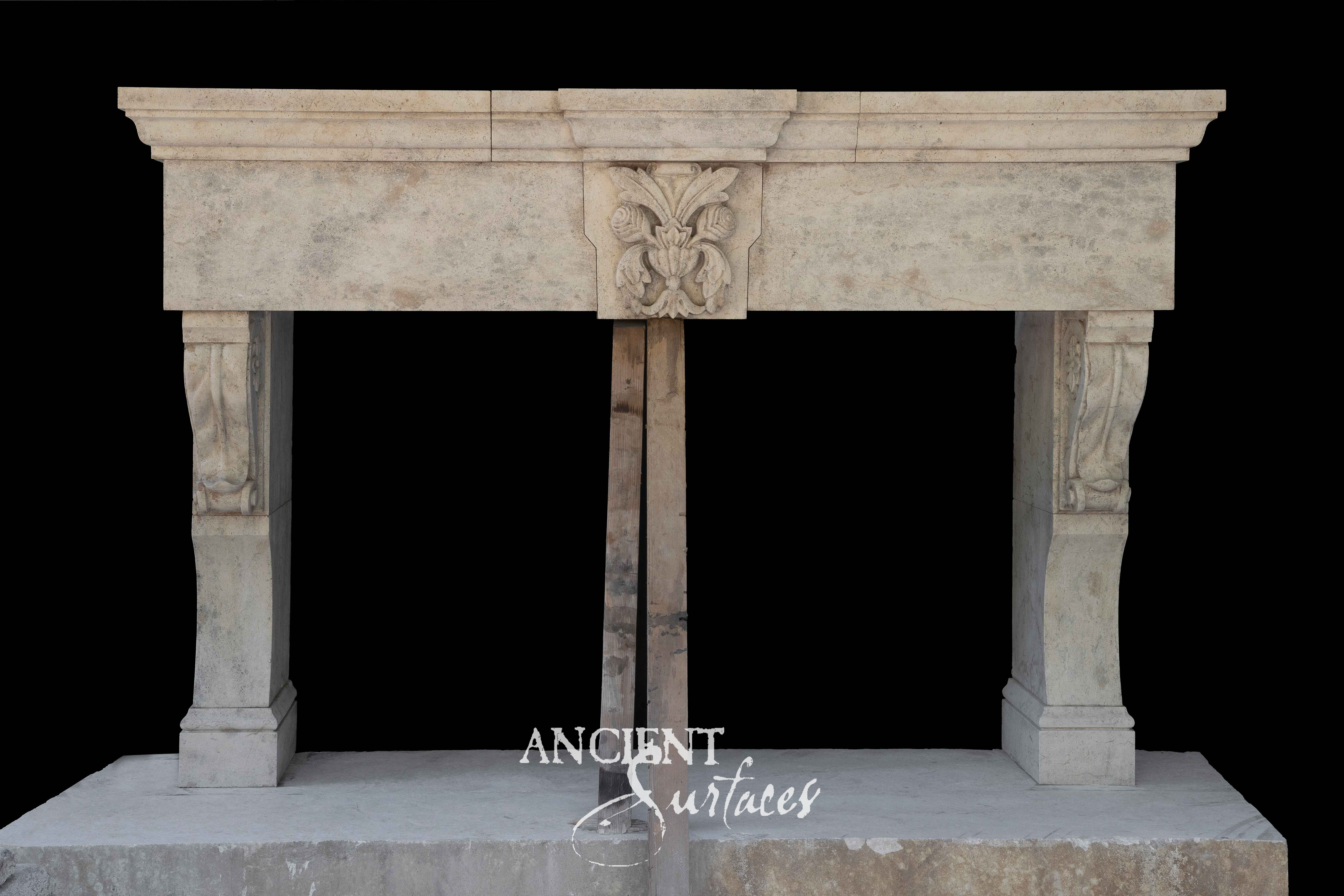Seen in the first image, this commanding limestone hood towers above the range like a work of art. Its hand-carved details and soft patina tell of centuries-old craftsmanship reimagined for the modern home. The sculpted corbels, scrolling motifs, and solid massing embody the balance of proportion and power. For the homeowner who seeks a kitchen that exudes character and refinement, this design embodies that old-world soul that only Ancient Surfaces can revive.