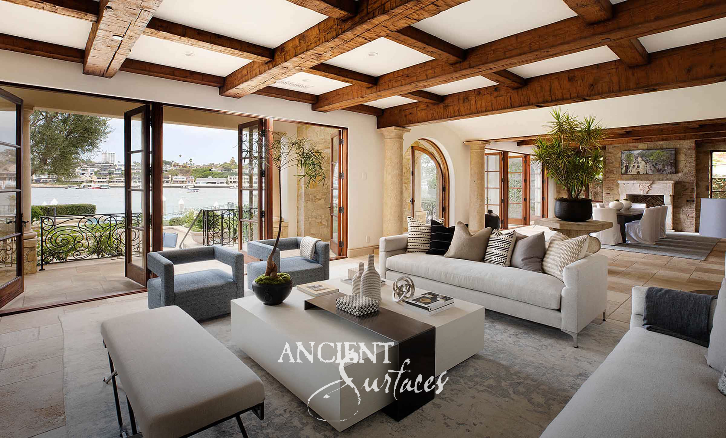 In the first space, the luminous living room overlooking the water becomes even more distinguished through the presence of a reclaimed limestone mantle that anchors the interior’s clean, modern palette. With exposed wooden beams overhead and panoramic doors leading to the terrace, the carved limestone mantle adds a refined European counterpoint to the airy California coastal elegance. This combination of reclaimed stone and natural light is where Ancient Surfaces thrives, seamlessly merging antiquity with contemporary architecture in a way that feels intentional and effortlessly high end.