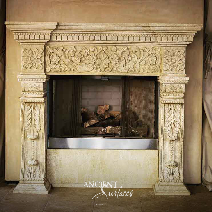 In the more ornate example, an intricately sculpted masterpiece decorated with layered botanical carvings demonstrates how antique limestone can elevate a luxury estate. The mantle’s generous proportions, classical motifs, and quiet aging make it a crown jewel in the room. Paired with soft neutral upholstery and warm golden lighting, it becomes the architectural heart of the space. No material ages with such grace as reclaimed limestone, and no carving style carries such emotional weight as the ones sourced and restored by Ancient Surfaces.