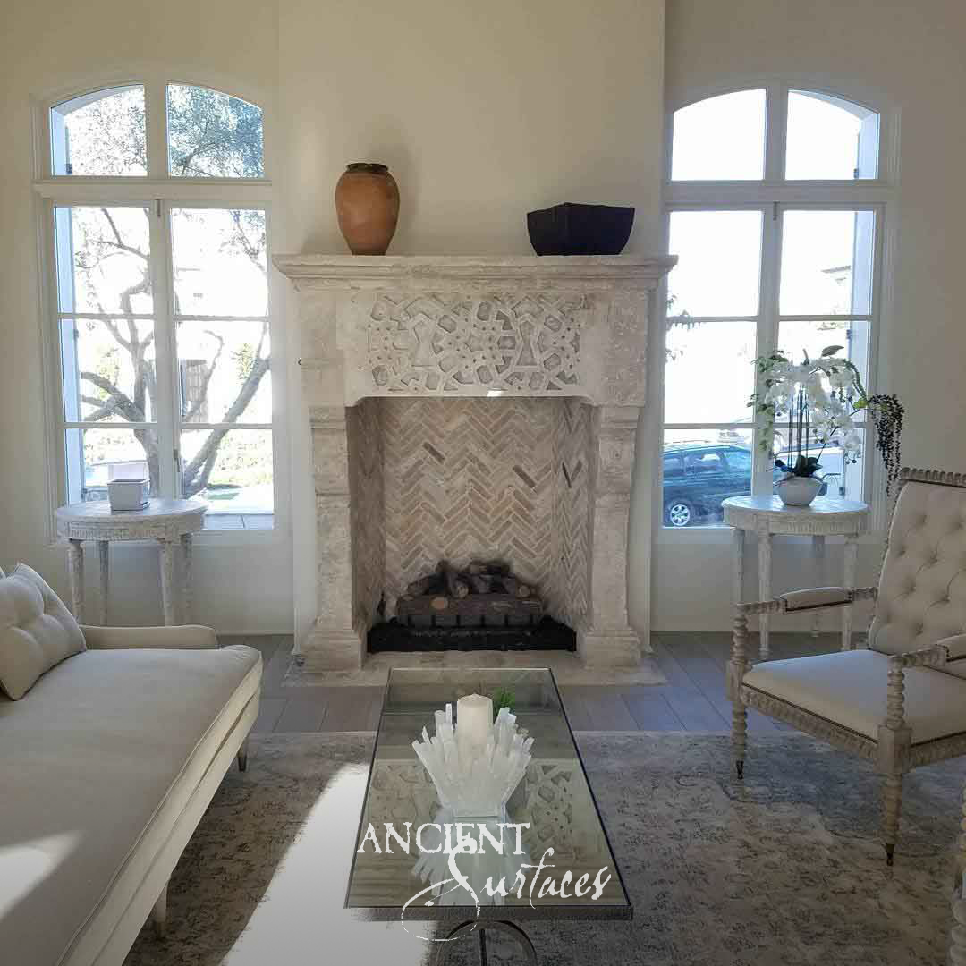 Another mantle, featuring deeply sculpted corbels and a richly textured hood, transforms an otherwise simple niche into a museum level architectural showcase. Its herringbone firebox accentuates the craftsmanship of the carved limestone, proving once again that reclaimed materials bring a dimensional quality new stone cannot replicate. The delicate variations in color, the timeworn patina, and the hand chiseled relief details reveal the story of generations who lived with these mantles long before they became part of a new home. This is the true essence of reclaimed limestone and the reason designers and collectors around the world seek Ancient Surfaces.