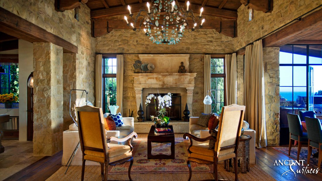 Here’s an antique limestone mantle above was salvaged from France and was raised by a hearth to perfectly fit an existing fireplace box in California.