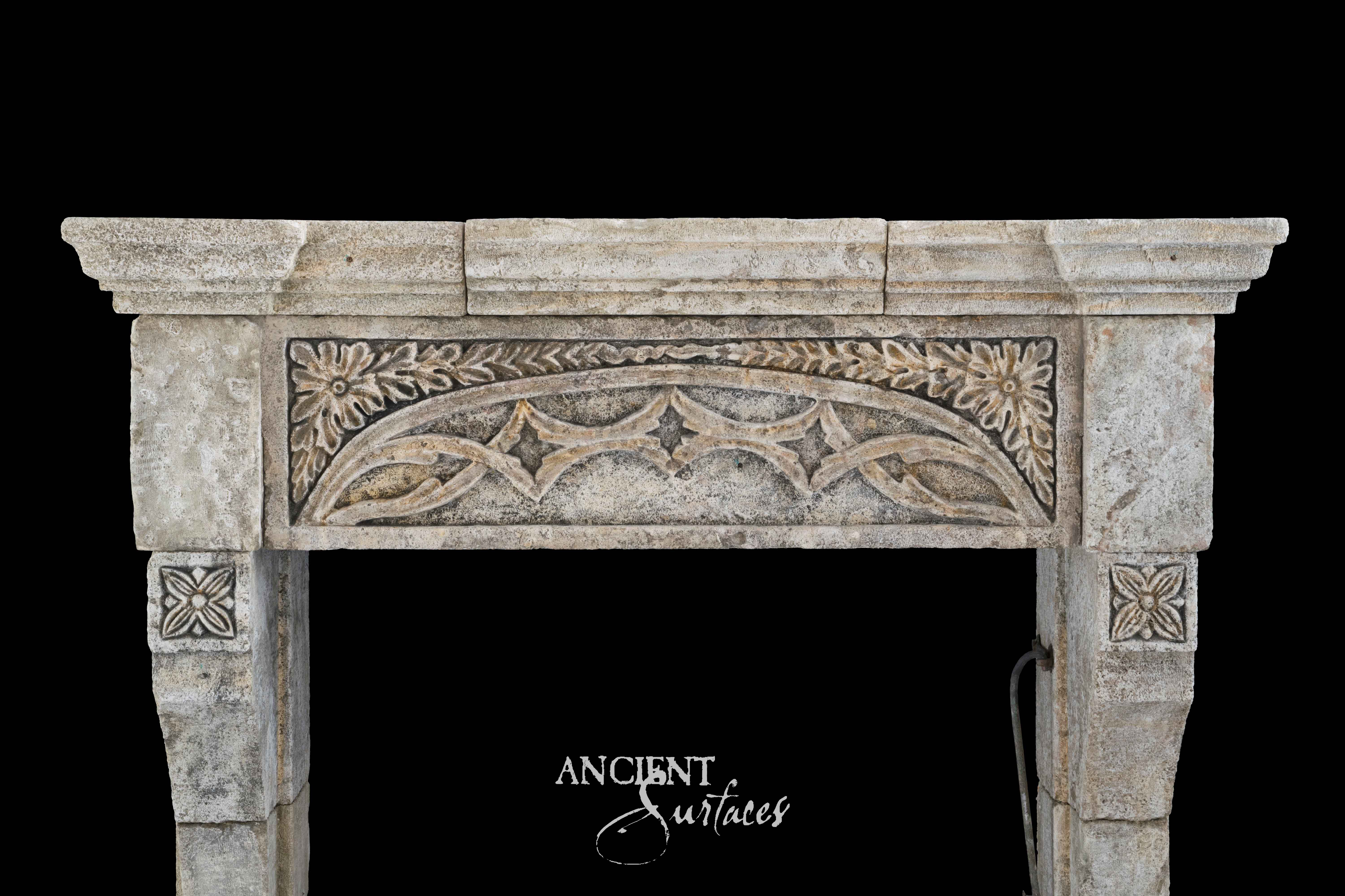 This limestone mantle is a symphony of nature, its frieze richly carved with meandering vines, blossoms, and foliate scrolls. The design recalls the late Renaissance’s love of botanical motifs and garden symbolism. Every petal and leaf carved into the mantle radiates artisanal care, making it a living relic of estates that once celebrated man’s harmony with nature.