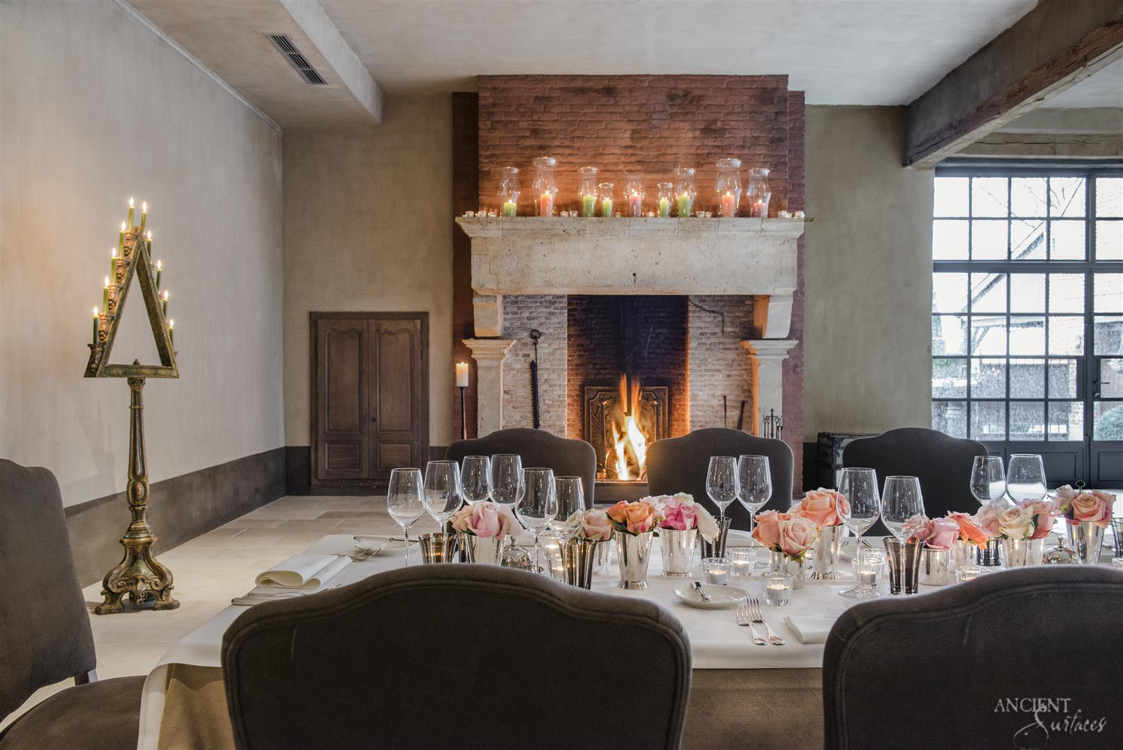 Within the dining room’s white ambiance, a fireplace adds a soft undertone of warmth. Here, the fireplace isn’t just a source of heat; it’s an integral part of the dining experience, inviting guests to linger longer as the flames cast a gentle glow on the pristine surroundings. The antique stone of the fireplace reflect purity and elegance, perfectly complementing the sophisticated dining area.